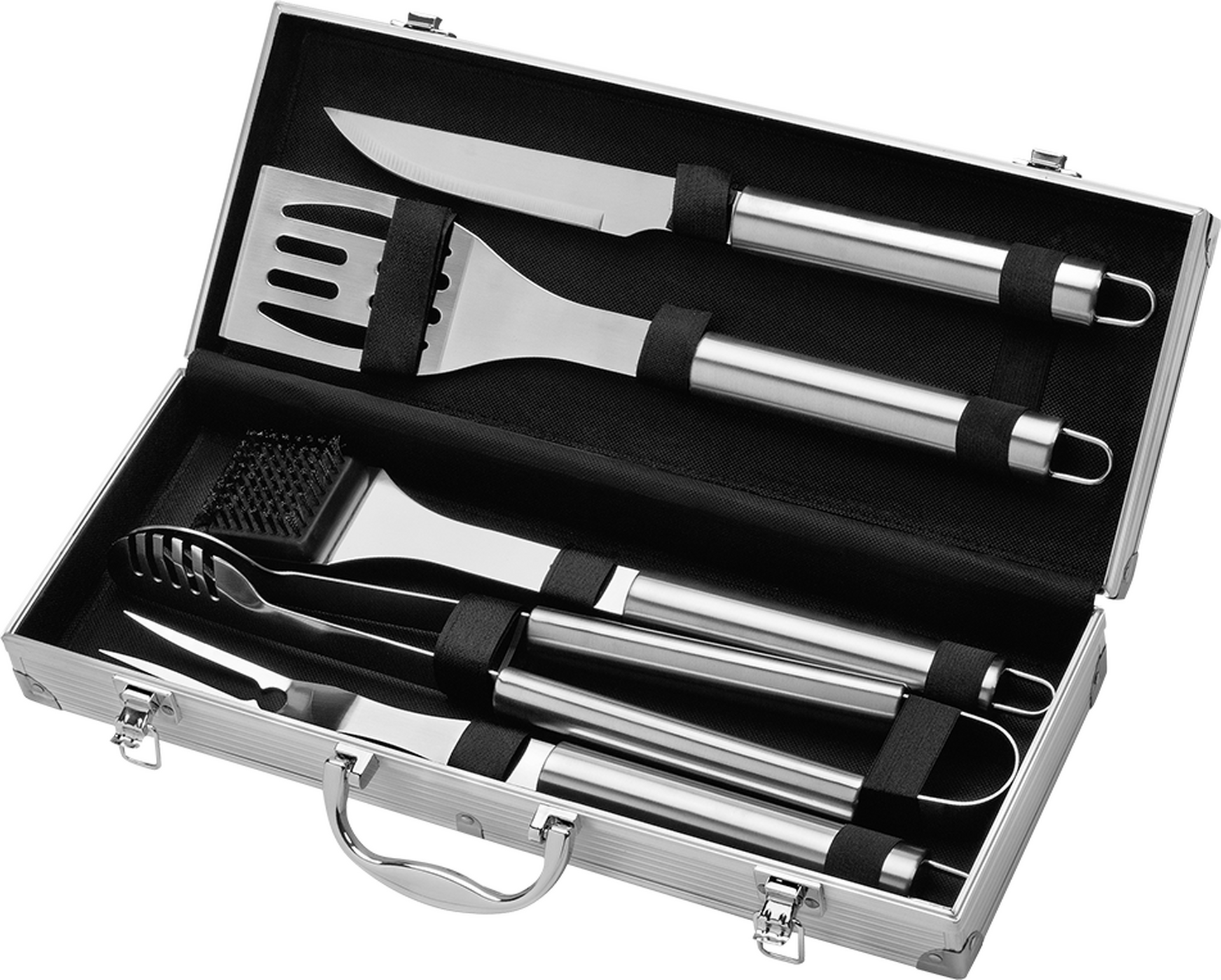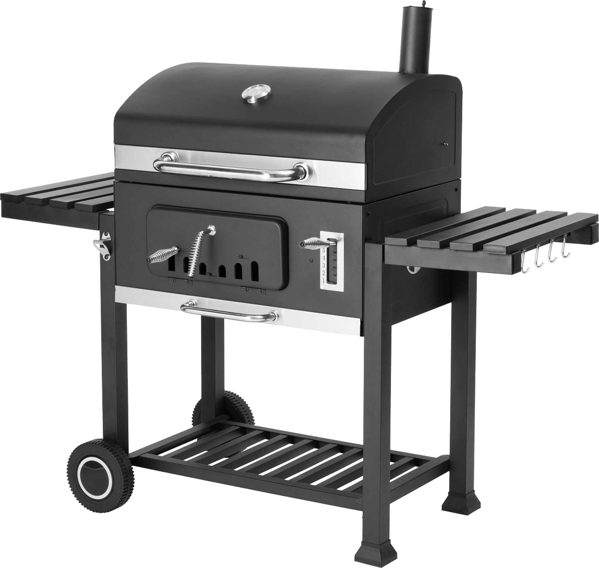 Zománcozott öntöttvas multifunkciós sütőrács, porszórt acél váz és tűztál, krómozott acél melegítő rács; Kivehető hamutartó; 6 fokozatban állítható faszén tartó; Állítható légáteresztő szelepek, állítható közvetlen tűztér nyílás és füstelvezető kémény; Mindkét oldalán lehajtható asztalokkal, beépített hőmérővel, sörnyitóval és akasztó kampókkal; Mérete: 136x153x71 cm Sütőfelülete: 71.5x46.5 cm